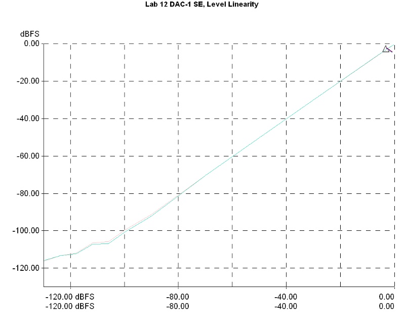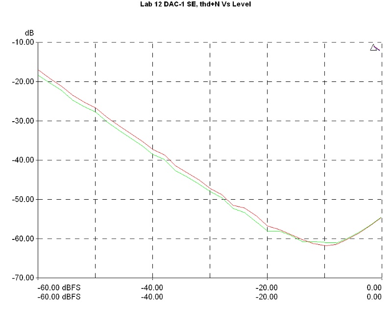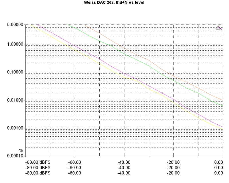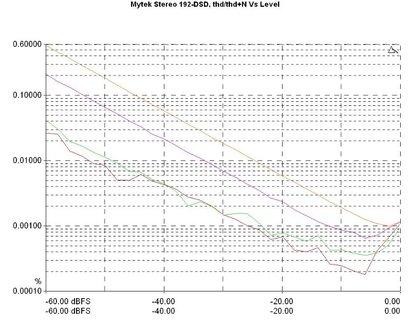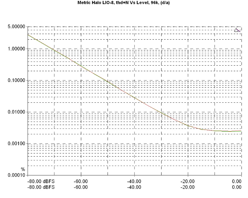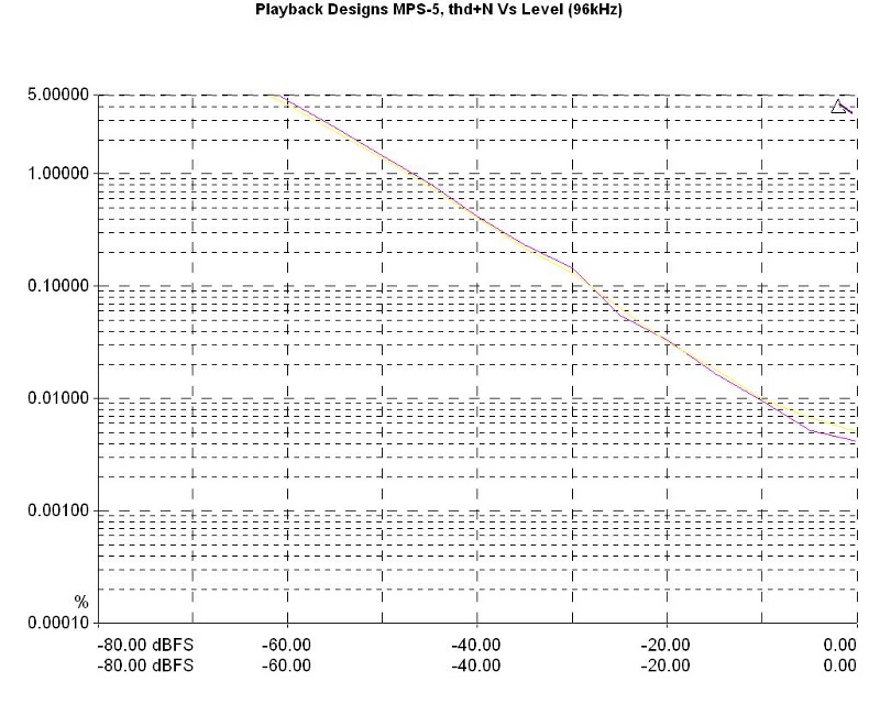 Αρμονική παραμόρφωση σε συνάρτηση με την στάθμη. Sample rate 96kHz, είσοδος S/PDIF, THD+N (μοβ καμπύλη), THD (μπλε).