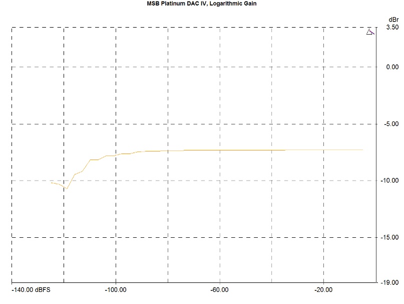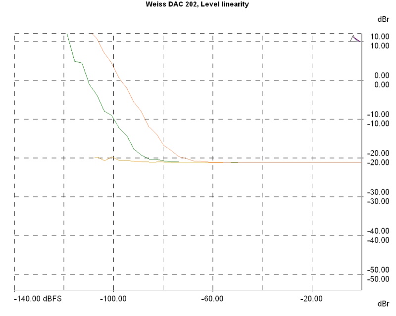 Αναλογικός προενισχυτής: παραμόρφωση σε συνάρτηση με την στάθμη εξόδου. THD+N (μοβ καμπύλη), THD (μπλε).